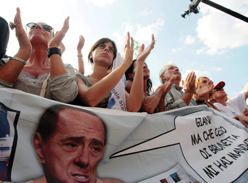 RIGHT: Demonstrators hold a banner that hints at the scandals surrounding Berlusconi. The banner reads, “Gianpy, the brunette you sent me was a real dog wasn’t she?” Gianpy is businessman Gianpolo Tarantini, who has provided escorts in the past.
